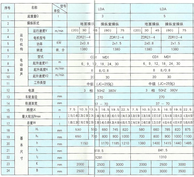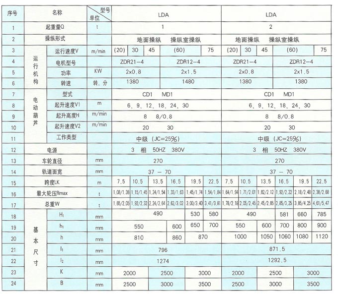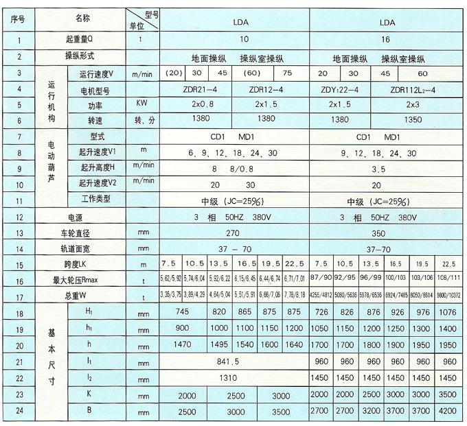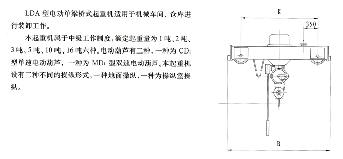 LDA型電動單梁橋式起重機多用于機械車間、倉庫進行裝卸工作。 本起重機屬于中級工作制度,額定起重量為噸、2噸、3噸、5噸、10噸、16噸六種。電動葫蘆有兩種,一種是CD1型單速電動葫蘆,一種為MD1型雙速電動葫蘆。本起重機設(shè)有兩種不同操縱形式,一種地面操縱、一種是操縱室操縱。