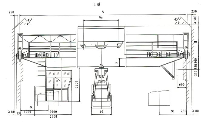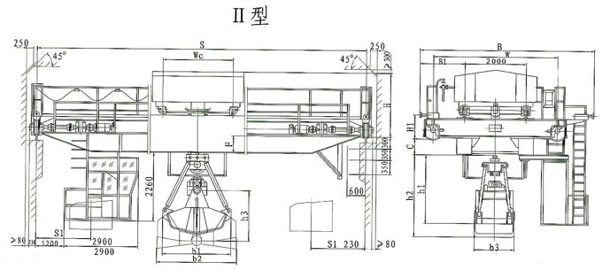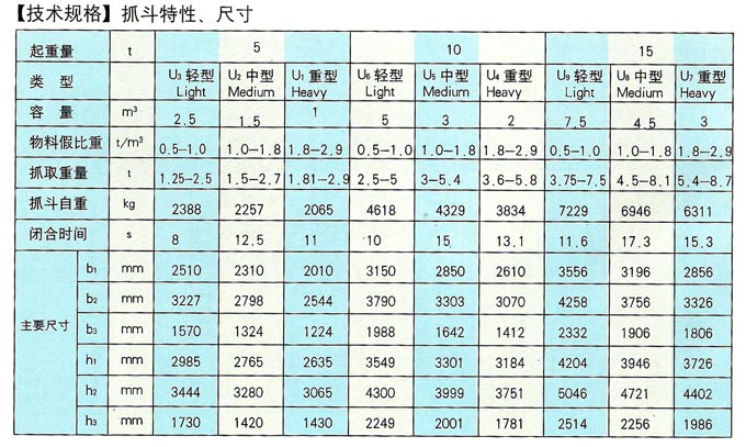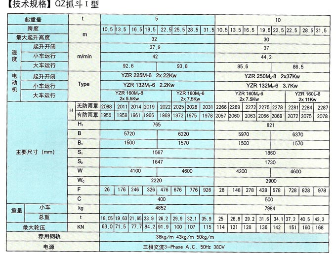 本起重機屬于A6工作級別。額定起重量包括抓斗自重在內(nèi),抓斗視所抓物料不同,分為輕型、中型、重型三種類型,按特性表選用。抓斗開閉型式分Ⅰ型、Ⅱ型兩種?! ‘斅短焓褂脮r,帶有防雨設備防雨設備,此時起重機總重及輪壓約增加5%。